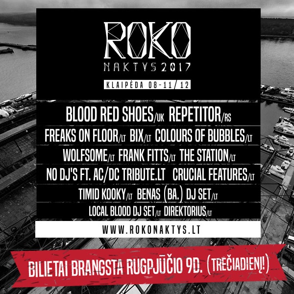 Šių dienų roko pasaulio žvaigždes „Blood Red Shoes“ bus galima pamatyti festivalyje „Roko naktys“ šeštadienį, rugpjūčio 12 dieną, 22.10 val. Prieš juos, 21 val. scenoje gros „Freaks on Floor“. Nuo 20 val. – BIX, nuo 19 val. „The Station“, o pačios pirmosios šeštadienį 18 val. prie mikrofonų stos Vilniaus pankės „Crucial Features“. Naktį po „Blood Red Shoes“ pasirodymo publiką šokdins „No DJ‘s goes AC/DC“ su Viktoru Diawara ir Blėka, o po jų iki vėlumos prie DJ pulto dirbs Direktorius.