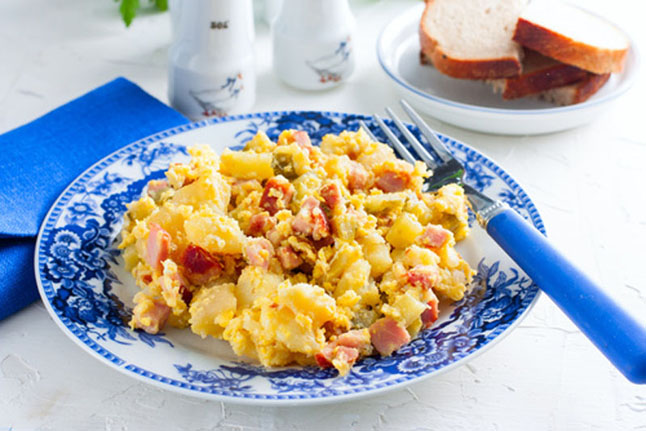 Jums reikės: 400 g virtų bulvių, 2 svogūnų, 120 g kumpio, 100 g marinuotų agurkų, 2-3 kiaušinių, 2 šaukštų grietinėlės, augalinio aliejaus, druskos, pipirų, muskato riešuto miltelių, žalumynų.