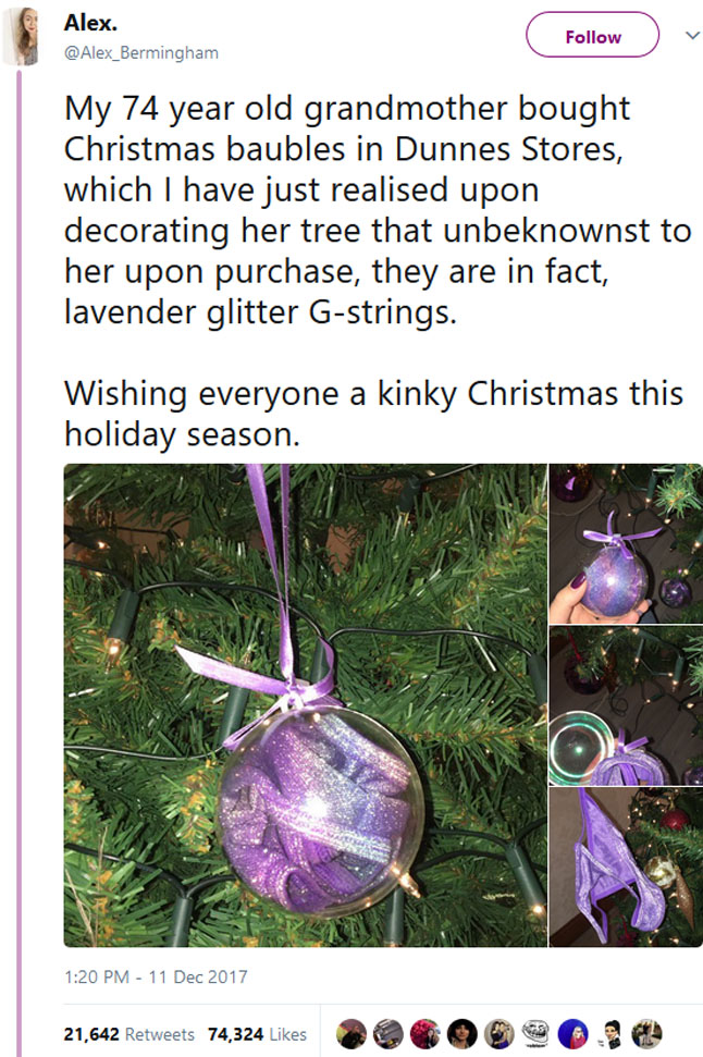 Viename socialiniame tinkle Aleks Bermingem iš Airijos papasakojo apie juokingą nesusipratimą jos senelės namuose. 74-erių moteris namų reikmenų parduotuvėje nusipirko gražius blizgančius eglutės žaisliukus-burbulus ir grįžusi papuošė kalėdinę eglutę.