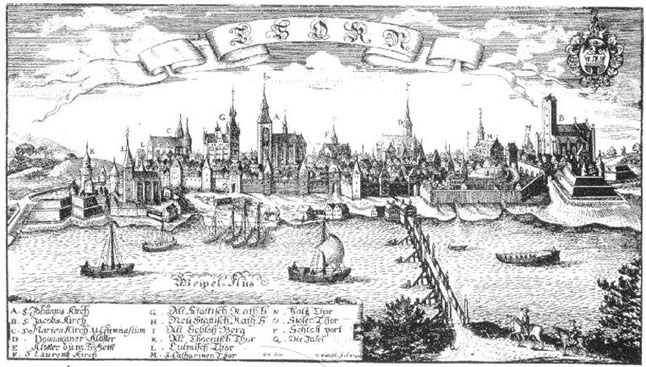 TORUNĖ, kur gimė M. Kopernikas. (1684 m. graviūra, "Wikipedia" nuotr.).