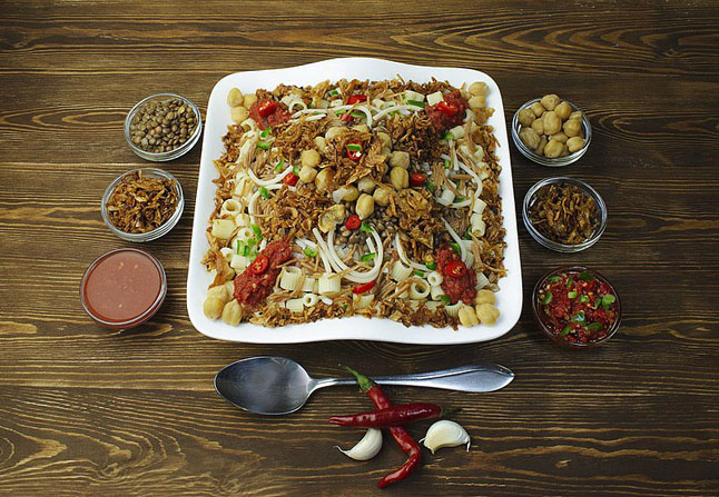 Vienas populiariausių greitų patiekalų Egipte yra "Kushari": tai ryžiai, lęšiai, makaronai su keptais svogūnais ir pomidorų padažu.