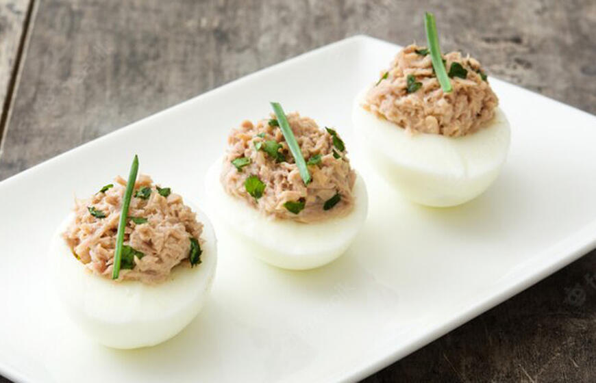 * Į baltymus sudėkite trynius, pertrintus su majonezu, ant viršaus - raudonųjų ikrų, papuoškite petražolės šakele.
