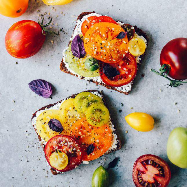 3. Ant duonos tepame varškės užtepėlės, dedame pomidorų.