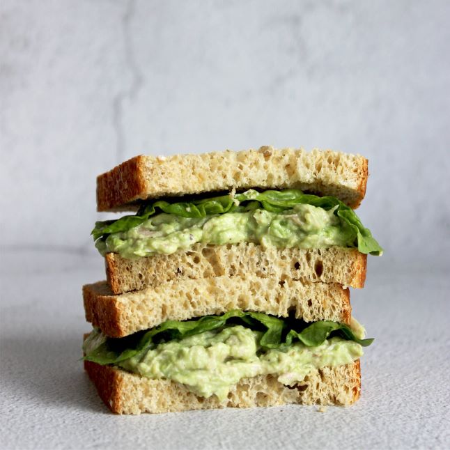 4. Ant avižinės duonos riekės dedame vištienos ir avokado salotų, ant jų - salotos lapą ir kitą duonos riekę.