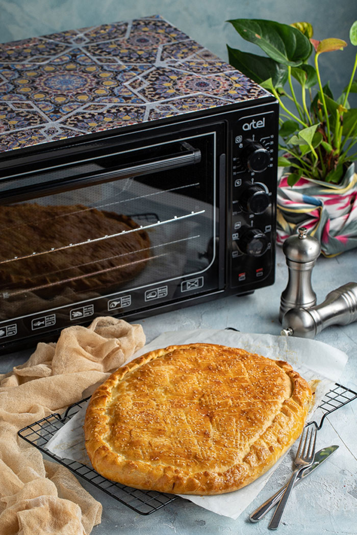Iškočiokite antrąją tešlos dalį ir uždenkite įdarą, gerai užspauskite kraštus.