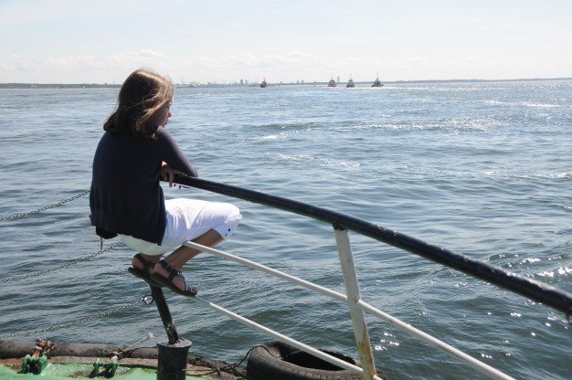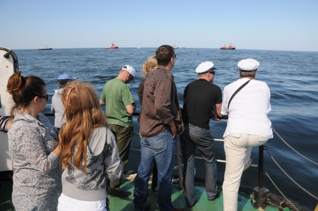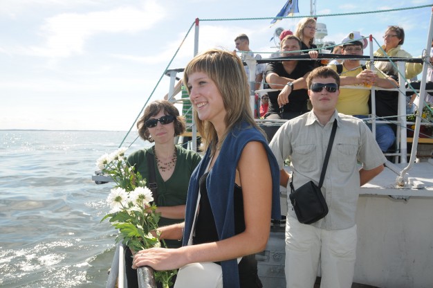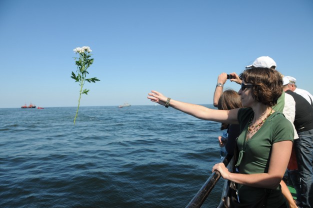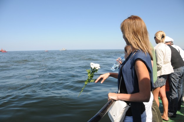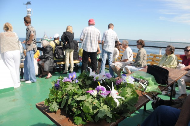 Laivu “Aukštaitis” D. Grybauskaitė plaukė į atvirą jūrą, kur nuleido vainiką žuvusiesiems.