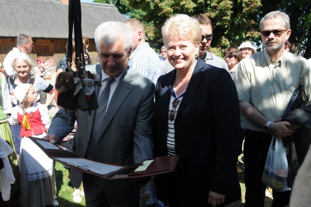 Už didelę medinę šakutę ir šaukštą garbioji šventės dalyvė paklojo 30 litų su nuolaida. Paskutinė dovana prezidentei – iš Kalvystės muziejaus vadovo Dionyzo Varkalio: kuršiška apyrankė.