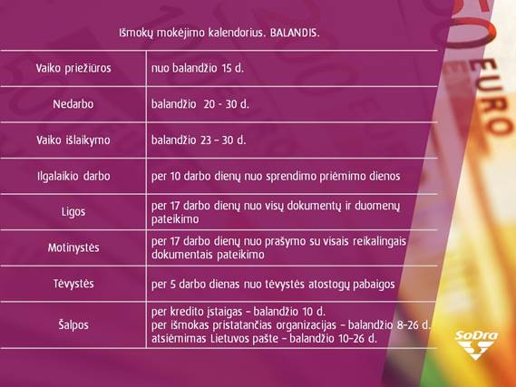 Nuo balandžio 15 d., kaip įprasta, pradedamos mokėti vaiko priežiūros išmokos. Nedarbo išmokų mokėjimas numatytas nuo balandžio 20 dienos, vaiko išlaikymo išmokos gyventojus pasieks nuo balandžio 23 dienos.