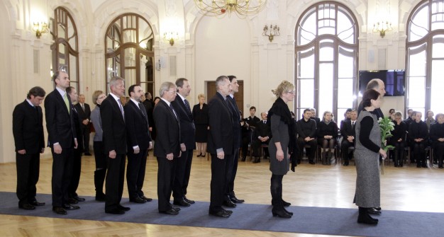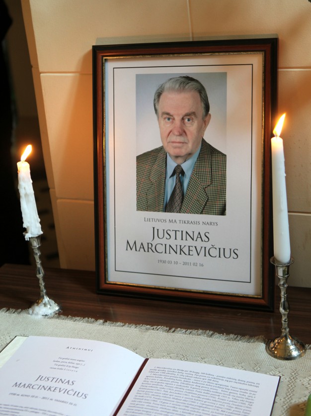 Vasario 16-ąją miręs Justinas Marcinkevičius pašarvotas Lietuvos mokslų akademijos Didžiojoje salėje, kurioje 1988 metų vasarą įvyko pirmieji Lietuvos Sąjūdžio iniciatyvinės grupės posėdžiai. Šios grupės narys ir aktyvus Lietuvos laisvės šauklys buvo J. Marcinkevičius.