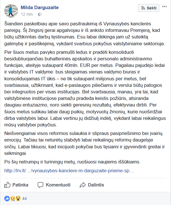„Tai sunkus sprendimas, tačiau po ilgų svarstymų nusprendžiau karjerą tęsti kitoje srityje ir apie tai informavau premjerą. Džiaugiuosi, jog jis suprato mano pasirinkimą. Esu labai dėkinga premjerui už suteiktą galimybę ir pasitikėjimą vykdant svarbius pokyčius valstybiniame sektoriuje. Taip pat noriu padėkoti vyriausybės kanceliarijos, ministerijų, kitų valstybės įstaigų darbuotojams už aktyvų bei produktyvų darbą kartu, už pasiektus rezultatus. Palieku pareigas būdama tikra, jog inicijuoti pokyčiai bus tęsiami, reformos – įgyvendintos, o visuomenei ir valstybei svarbūs tikslai – pasiekti“, – vyriausybės pranešime spaudai cituojama M. Dargužaitė.