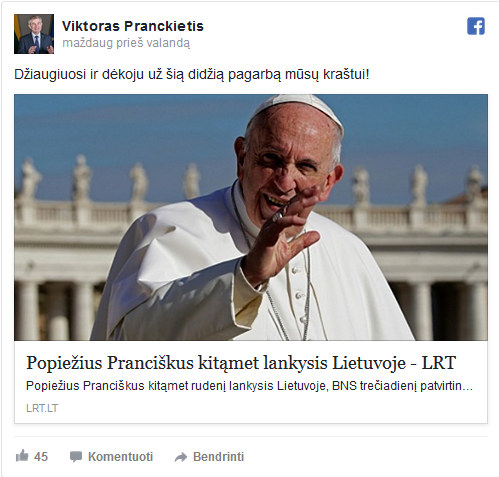 „2018 metų rudenį numatomas popiežiaus Pranciškaus vizitas į Lietuvą. Vatikanas artimiausiu metu turėtų paskelbti tikslią vizito datą ir statusą“, – atsakydama į BNS klausimą, patvirtino prezidentės atstovė spaudai Daiva Ulbinaitė.