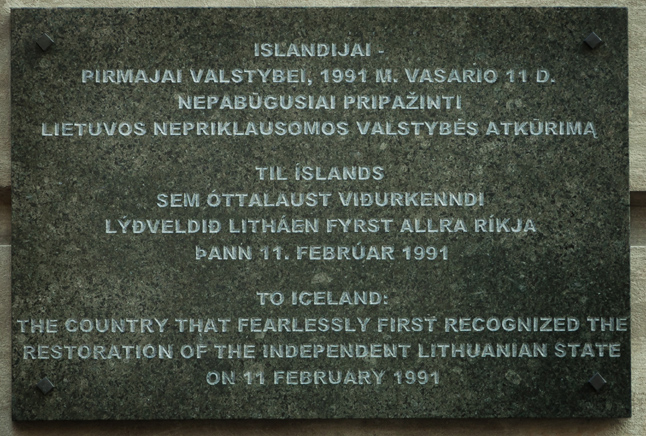 Islandija pirmoji iš visų šalių 1991 metų vasario 11 dieną pripažino Lietuvos nepriklausomybę. Diplomatinius santykius šalys užmezgė 1991 metų rugpjūčio 26 dieną. Atminimo lenta atidengta ant pastato Islandijos g. 3/18, Vilniuje.