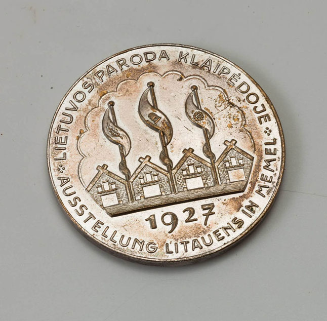 Aplinkui - užrašas lietuvių ir vokiečių kalbomis: LIETUVOS PARODA KLAIPĖDOJE / AUSSTELLUNG LITAUENS IN MEMEL 1927. UŽ YPATINGĄ ATSIŽYMĖJIMĄ