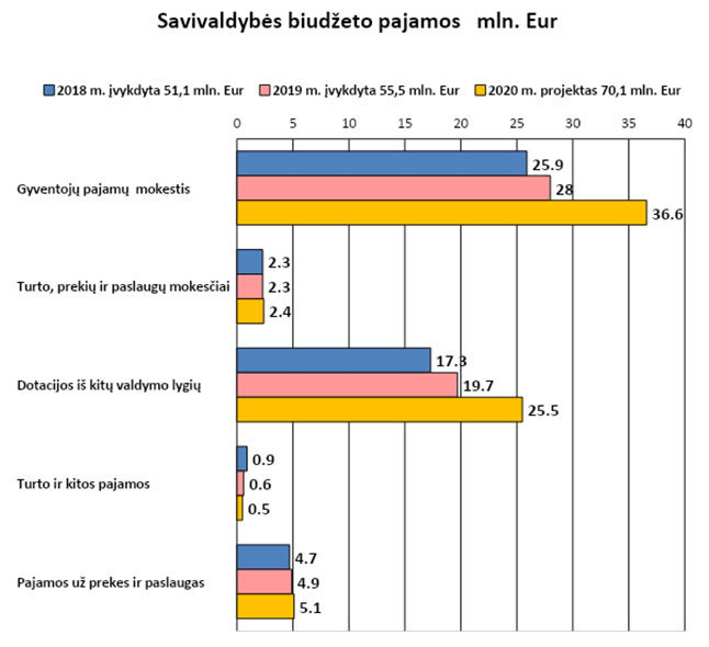 2020 m. planuojamas pajamos, lyginant su praėjusių metų įvykdytomis, didėja 14,5 mln. eurų. Didėjimą nulemia 8,6 mln. eurų didėjančios pajamos iš GPM, bei 5,8 mln. eurų didėjančios dotacijos. Pajamos už prekes ir paslaugas didėja 0,2 mln. eurų, turto mokesčiai ir turto pajamos bei kitos pajamos planuojamos 0,1 mln. eurų mažesnės.