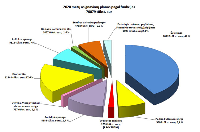 2020 m. savivaldybės biudžeto asignavimų planas rengiamas lygiagrečiai su Strateginio veiklos plano 2020-2022 metams projektu. Asignavimai planuojami, vadovaujantis patvirtintomis programomis, atsižvelgiant į sutartinius įsipareigojimus ir strateginio veiklos plano projekte 2020 metams numatomas priemones. Savivaldybės biudžeto asignavimai paskirstyti savivaldybės vykdomoms programoms finansuoti. 2020 m. asignavimų (be praėjusių metų lėšų likučių ir skolintų lėšų) struktūra pagal funkcijas pavaizduota diagramoje.