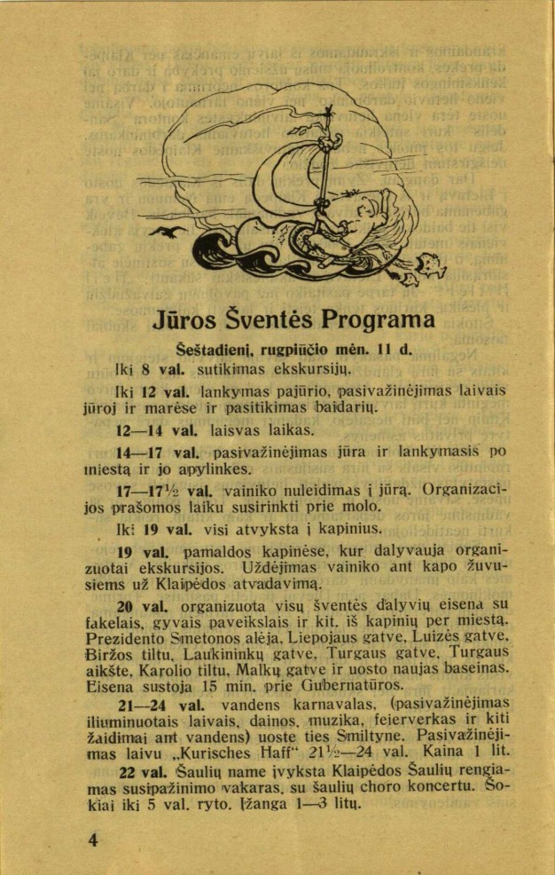 Toliau leidinyje pristatoma renginio programa. Pažymėtina, jog labai daug renginių siejami su jūra, vandens sportu, paplūdimiu, senosiomis lietuviškomis tradicijomis. „Pasivažinėjimas laivais“ – bene labiausiai dominuojanti pramoga.
