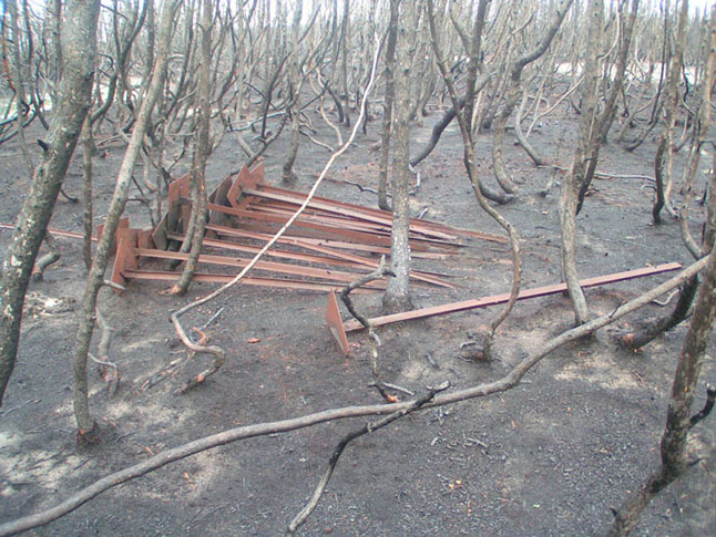 ...ir vokiečių kareivių į krūvą sumestus ir paliktus stovus, naudotus užtvarams prieš pėstininkus įrengti. Įdomu, kad po karo vietos gyventojai juos kūrybingai panaudodavo - medines lenteles prie žvejų kapų kabindavo ir ant tokių stovų.