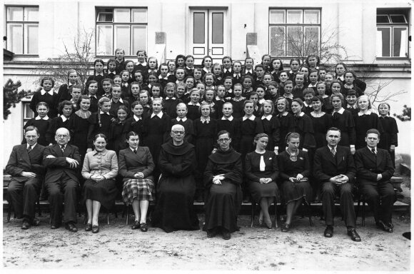 Kretingos pranciškonų gimnazijos mergaitės su pedagogais prie Šv. Antano rūmų pradedant mokslo metus 1939 m. Iš kairės: poetas Antanas Kirtiklis, Juozas Gedgaudas, centre kairėje Kretingos pranciškonų gimnazijos direktorius V.Zajančkauskas, dešinėje Kretingos Šv.Antano kolegijos rektorius tevas Justinas Vaškys, pirmas iš dešinės dailininkas darbėniškis Fabijonas Šulcas, antras iš dešinės Antanas Masionis.