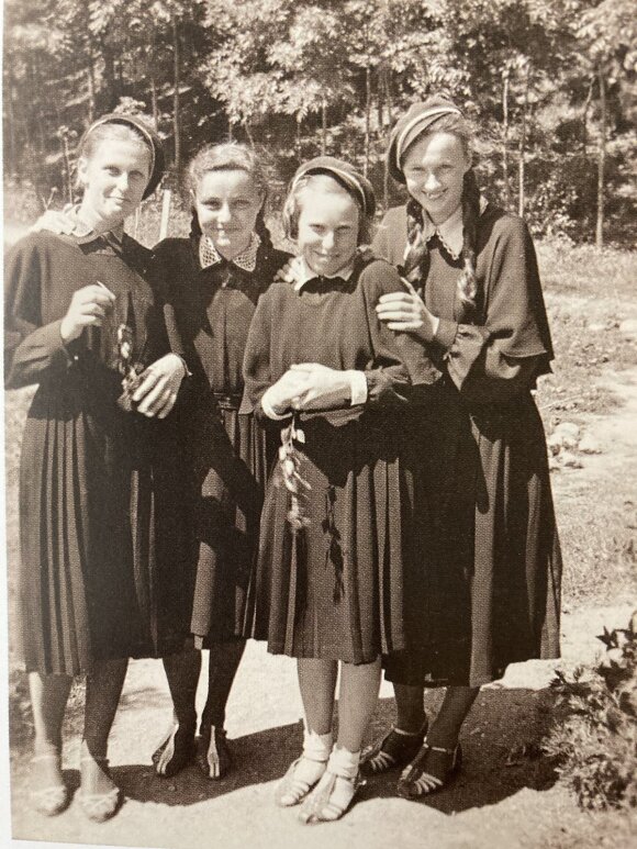 Kretinga apie 1940 m. Kretingos pranciškonų gimnazijos moksleivės (iš dešinės): pirma – Birutė Japertaitė, trečia – Estera Kverelytė.