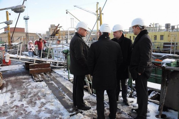 Penktadienį remontuojamo Klaipėdos miesto simbolio apžiūrėti atvyko Klaipėdos meras Vytautas Grubliauskas ir susisiekimo ministras Eligijus Masiulis.