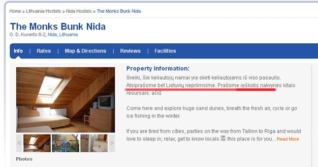 Skelbimas patalpintas keliuose nakvynės namų paieškos portaluose – Hostels.com, Hostelworld.com, Hostelzoo.com. Skelbime, kur nakvynės paslaugos siūlomos lietuviškame portale Priejuros.lt, nuo panašių įspėjimų susilaikoma. Ten nepateikiama informacija ir apie tai, kokia turėtų būti klientų tautybė – šįkart parašyta, kad nepageidaujami tik gyvūnai. „Jums tereikia susikrauti lagaminus ir atvykti ilsėtis į „The Monk`s Bunk“, mes pasirūpinsime Jūsų gerove ir poilsio ramybe“, - rašoma lietuviškai suprantantiems žmonėms skirtame skelbime.
