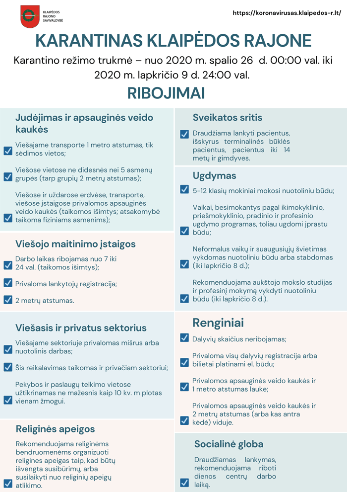Vyriausybė vakar apsisprendė: siekiant sustabdyti koronaviruso plitimą net 12-oje šalies savivaldybių skelbiamas lokalus karantinas. Į šį sarašą pateko ir Klaipėdos rajonas. Karantinas čia, kaip ir kitur, prasidės pirmadienį ir truks dvi savaites – nuo spalio 26 d. iki lapkričio 9 d.