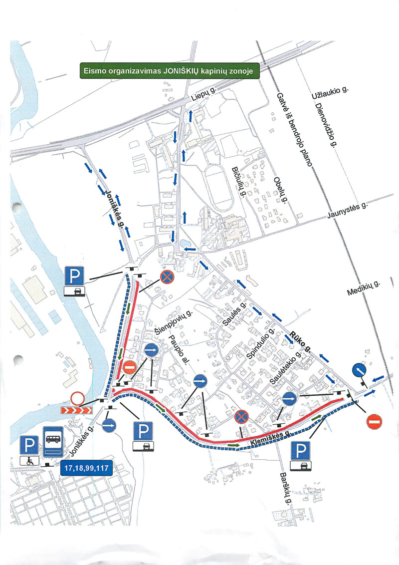 Dėl Joniškės gatvės rekonstrukcijos, Joniškės gatve nuo Mokyklos gatvės, motorinių transporto priemonių eismas draudžiamas, galimas pėsčiųjų eismas. Privažiavimas į Joniškės kapines galimas tik per Liepų gatvę: Joniškės gatve, Klemiškės gatve, Rūko gatve, Jaunystės gatve. Apvažiavimas organizuojamas pagal pridėtą schemą.