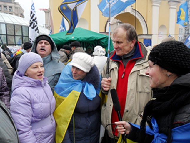 J.Pelionis pasakojo, kad protestuotojų minia buvo tokia tiršta, ypač – sekmadienį, kad buvo sunku judėti iš vienos vietos į kitą. „Atsiskyręs nuo saviškių būrio, vėl jų nepasieksi – žmonių pilna, kaip bažnyčioje per atlaidus. Tik pasitraukus vienam žmogui, gali stoti į jo vietą, o toliau – nė žingsnio,- pasakojo J.Pelionis. – Nuo scenos nuolat girdisi kalbos, koncertai. Teko ir mūsų, maždaug 30 žmonių grupei, atvykusiai iš Lietuvos, pasveikinti protestuotojus nuo scenos, išreikšti jiems palaikymą. Stovėjome šalia „Eurovizijos“ konkurso nugalėtojos Ruslanos, kuri sugiedojo Ukrainos himną. Ruslana aktyviai remia protestuotojus ir sako kalbas, koncertuoja. Mačiau, kad minioje daug kitų šalių vėliavų – ne tik iš Europos šalių, bet ir JAV, Kanados. Turbūt būtų lengviau pasakyti, kokios šalies vėliavos nebuvo.“