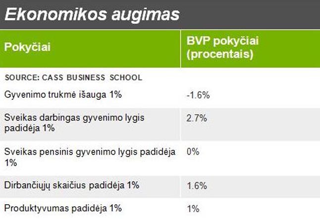 Dabar pateikiu duomenis ir iš Didžiosios Britanijos. Joje manoma, kad padidėjus sveiko darbingo gyvenimo lygiui 1 proc., šalies bendras nacionalinis produktas išauga 2,7 proc.