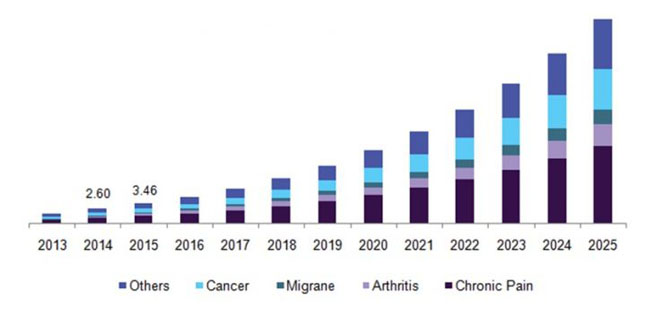 Aišku, jog kalbama apie vadinamąją medicininę marihuaną. Štai viena schema irgi iš JAV ( Kokioms ligoms gydyti ji naudojama: lėtinis skausmas, artritas, vėžys ir kt., bei kainos ar rinkos įvertis milijardais dolerių):