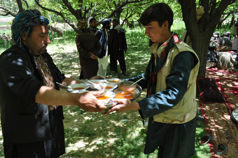 Užkandome duonos, laikas pereiti prie pagrindinių patiekalų. Tik pradėjęs afganų virtuvės "studijas" supratau, kad dominuoja vegetariški patiekalai. Ir ne todėl, kad afganai nemėgtų mėsos. Mėsa čia yra prabanga bei patiekiama tik ant šventinio stalo. Ryžiai - populiariausias maistas ir pirmasis patiekalas, kurio paragaujame priėmimo metu. Virti basmati rūšies ryžiai dažniausiai maišomi su auksinėmis razinomis, morkomis, pupomis ir migdolų riešutais - visa tai patroškinama iki tikrai puikaus skonio vaivorykštės. Tokį patiekalą turbūt mes pavadintume plovu, italai - rizotu (daugiaryžiu), ispanai - paelija, o vietiniai vadina guštu-berenč.