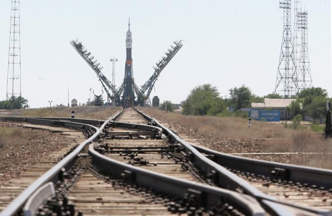 Sekmadienį "Sojuz" nešančiąją raketą traukinys atgabeno į Kazachstano Baikonuro kosmodromo raketos paleidimo aikštelę, vadinamą Jurijaus Gagarino aikštele. Iš šios vietos 1961 m. pakilęs J. Gagarinas tapo pirmuoju kosmose pabuvusiu žmogumi.
