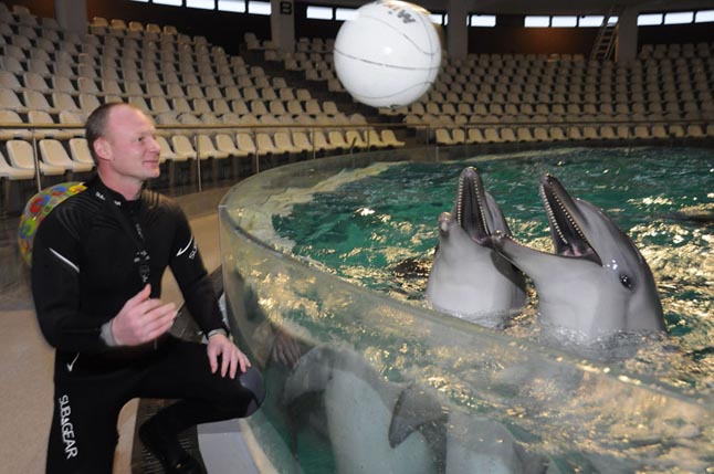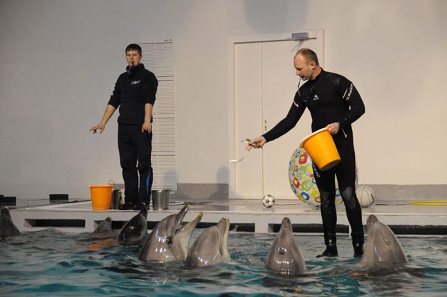 Mes, septyni čia dirbantys delfinų ir jūrų liūtų treneriai, esame baigę su biologija susijusius mokslus. Aš Klaipėdos universitete studijavau ekologiją. Dalyvavau trenerių konkurse, ir man pasisekė. Jokių specialių kursų nebuvo - gryna praktika. Mokiausi iš kolegų, iš literatūros, nuolat semiamės patirties iš užsienio kolegų, nes Lietuvos jūrų muziejus yra tarptautinės trenerių asociacijos narys. Kasmet vyksta įvairios konferencijos Europos šalyse, kolegos susirenka iš visų pasaulio vietų ir dalinamės patirtimi, visko gi nemokėsi. Kalbamės apie gyvūnų treniravimą, priežiūrą, ligas. O grįžę namo kasdien stebime, kaip globotiniai jaučiasi, kokia jų elgsena. Jeigu suserga, kas nors atsitinka, turime savo veterinarijos gydytoją Žilviną Kleivą. Susirūpiname, jeigu delfinas pasyvus, nenori priplaukti, apetitas suprastėjęs, nesukaupia dėmesio.