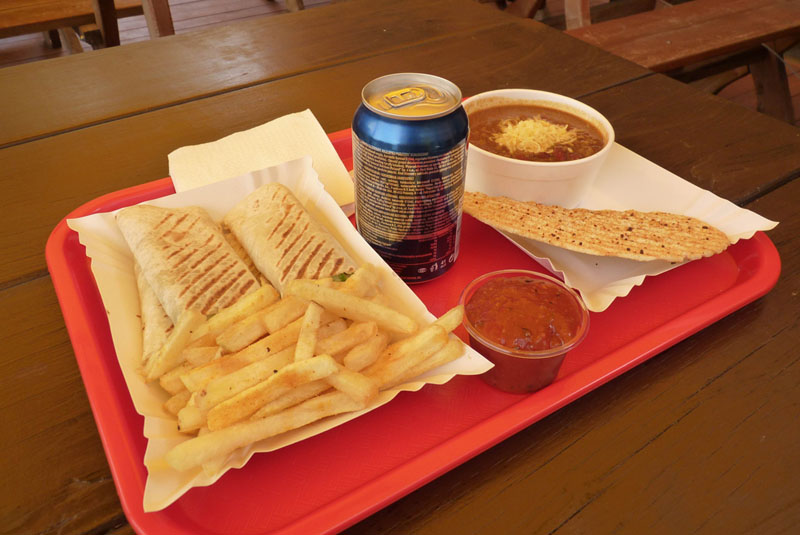 Išsirinkau meksikietišką "čili" sriubą (5,9 lito) ir tortilijų kompleksą su keptomis bulvytėmis (10,9 lito). Prie komplekso pridėjo ir gazuoto gėrimo skardinę.