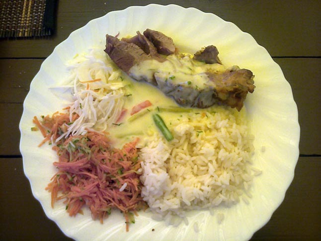 Kad ir kaip skubėjau valgyti sriubą (ją pabaigęs pasigedau servetėlių), baltu padažu apipiltas kepsnys visgi atšalo, nors tikriausiai ir iki tol nebuvo labai karštas. Kaip garnyras jam buvo patiekti ryžiai, kopūstai bei morkos. Kepsnio mėsa minkšta, tačiau nelabai maloniai nuteikė bekramtant aptiktos kaulo skeveldros. Pats kepsnys irgi turėjo kaulą, tiesa, nedidelį. Jei būtų buvęs bent jau šiltas, gal ir būtų neblogas, tačiau dabar jį valgydamas nejaučiau jokio malonumo.