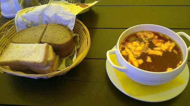 Sriuba nebloga, tik viską gadino kažkoks neaiškus plaukiojantis objektas. Galbūt didesnis svogūno gabalas. Dėl viso pikto išėmiau jį.