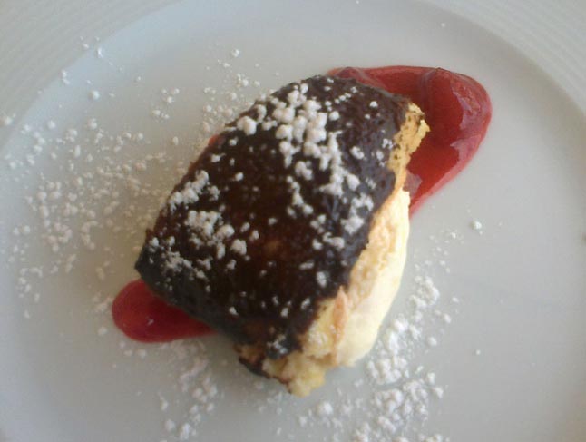 Padavėjas prisistatė labai greitai ir paliko meniu. Jame skilties "Dienos pietūs" neradau. Kadangi visų patiekalų kainos čia nemenkos, blogiausiam atvejui buvau išsirinkęs blynelius su ledais, kurie kainavo 12 litų. Visgi netrukus sugrįžęs padavėjas į klausimą, ar čia yra dienos pietų kompleksas, atsakė teigiamai ir išvardino: trinta daržovių sriuba, menkės, vištienos kepsniai ir salotos (berods graikiškos). Kainų nepaminėjo, tad rinkausi nemačiomis - nusprendžiau valgyti sriubą ir vištieną.