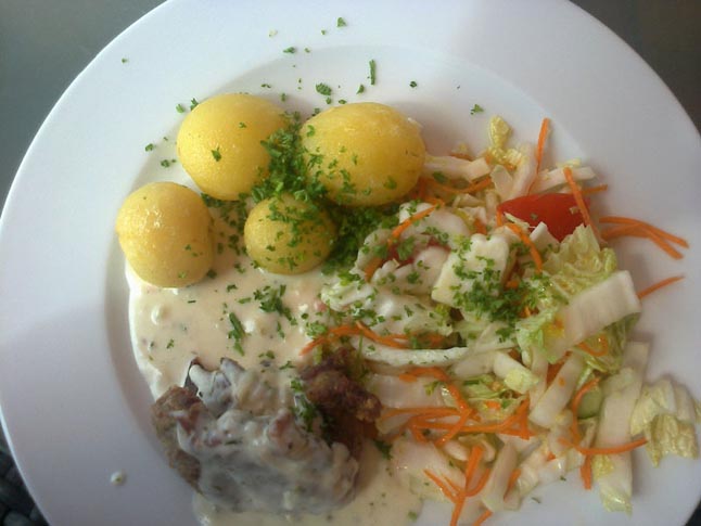 Antro patiekalo teko laukti kur kas ilgiau nei sriubos. Kai jį pamačiau, tai iš pradžių net pagalvojau, jog atnešė kažkokį kotletuką, o ne kiaulienos sprandinės kepsnį su šonine. Senokai jau nemačiau tokio miniatiūrinio kepsnio. Tačiau dėl jo skonio priekaištų tikrai neturiu. Kaip ir dėl salotų ar bulvių, tik kad jų prie tokio dydžio kepsnio tikrai buvo per daug, tad palikau vieną nesuvalgęs.