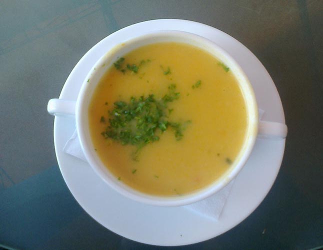 Padavėja meniu atnešė labai greitai. Dienos pietums vakar buvo siūlomi trys kompleksai - dienos sriuba su "Vegetarišku gausiu "Americano" picos ketvirčiu" (8,99 Lt), bulvių tarkainiai su vištienos padažu (9,99 Lt) arba kiaulienos sprandinė su šonine, patiekiama su virtomis ir apkeptomis bulvėmis, šviežių daržovių salotomis ir salierų padažu (12,99 Lt). Nusprendžiau rinktis pastarąjį patiekalą. Padavėja informavo, kad kartu bus patiekta trintų daržovių sriuba.