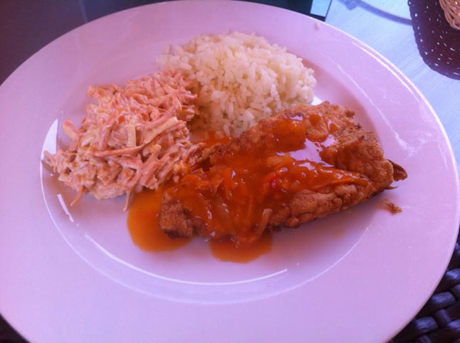 O kai į burną įdėjau pirmą žuvies kąsnį, atleidau ir tą niuansą, kad ryžiai jau buvo gerokai atvėsę. Žuvies kepsnys traškiame apvalkale, aplietas daržovių padažu, buvo labai gardus. Tiko ir morkų, salierų bei obuolių salotos, pagardintos majonezu. Porcija - vidutinė. Mėgstantiems daugiau pavalgyti gal ir būtų mažoka.
