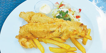 * Menkė, kepta tešloje, gruzdintos bulvytės, Pekino kopūstų salotos, majonezas.