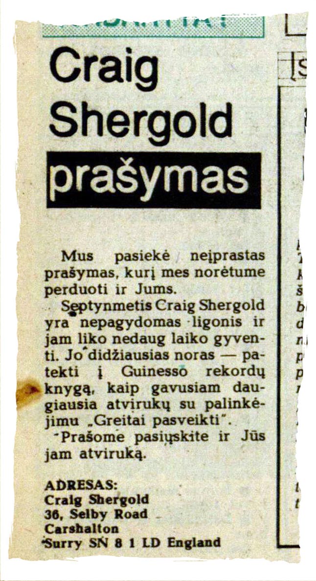 Ir dar pirmasis puslapis įdomus tuo, kad jo kamputyje VE išspausdino redakciją pasiekusį štai tokį trumpą laišką: "Septynmetis Craig Shergold yra nepagydomas ligonis ir jam liko nedaug laiko gyventi. Jo didžiausias noras - patekti į Gineso rekordų knygą, kaip gavusiam daugiausia atvirukų su palinkėjimu "Greitai pasveikti". Prašome pasiųskite ir Jūs jam atviruką". Ir nurodytas adresas Anglijoje.