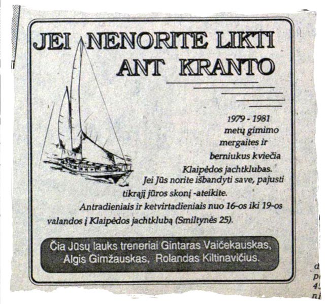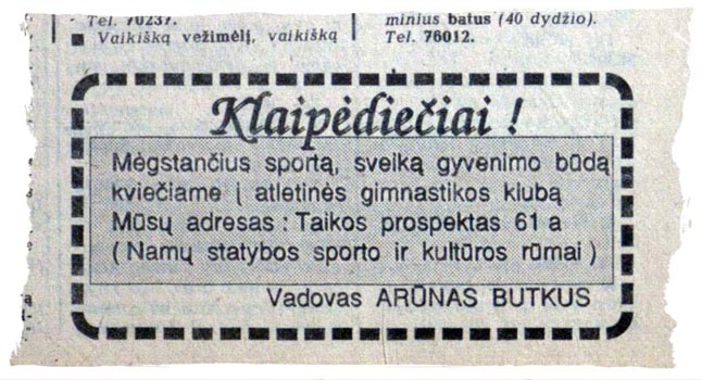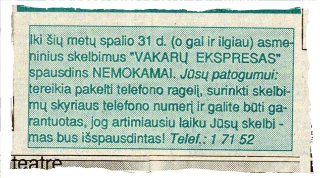 O desertui - vienas skelbimas (jų tame numeryje buvo nesuskaičiuojama daugybė - prasidėjo 3-iajame, o baigėsi 8-ajame, t. y. paskutiniame puslapyje) iš rubrikos "Keičiu": "Klaipėdos" prenumeratą į "Vakarų ekspreso". Tel. 59270, po 20 val."