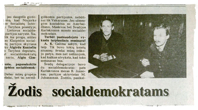 "Algirdas Brazauskas pareiškė, kad komunistų partija taip pat pasivadins socialdemokratų vardu. Mums keista, kad niekas net nesitaria su mumis, tikrais socialdemokratais. Tik duoda suprasti, kad susiliejimas vyksta. Tai ne tik kad nemandagu..." - Daliai Grikšaitei aiškino Lietuvos socialdemokratų partijos Klaipėdos skyriaus pirmininkas Algirdas Kuniutis ir miesto Tarybos narys Algis Gimžauskas.