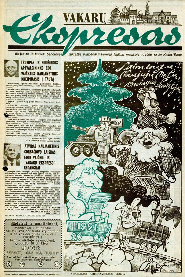 O šalia - "atviras naujametinis Gorbačiovo laiškas Edui Vaičkui ir "Vakarų ekspreso" redakcijai". Bet mes jo necituosime. Nieko ten nėra reikšmingo. Juolab kad Gorbis jokio laiško nei Vaičkui, nei redakcijai nerašė.