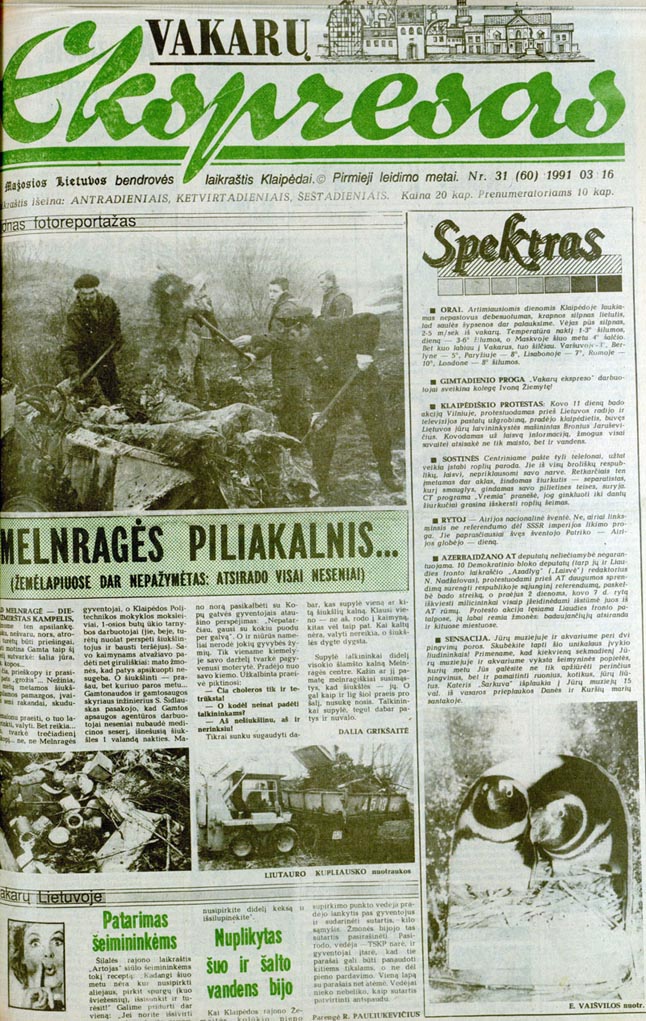 Tarp kitko - tomis dienomis ne nelegaliai į ligoninės požemius patekę VE žurnalistai jos vyr. gydytojui Vinsui Janušoniui (g. 1950 m., gyv. 16-osios divizijos g. 8-31) buvo didžiausias skausmas, o tai, kad jam Žvejų kultūros ir sporto rūmuose (kadaise ten buvo ir sporto, dabar - tik kultūra) besiklausant dviejų Artūrų (Orlausko ir Krukio) šposų, "visiškai nešposaudami vagys nuvarė jo automobilį VAZ-21063 (valst. Nr. K 59-65 LK)".