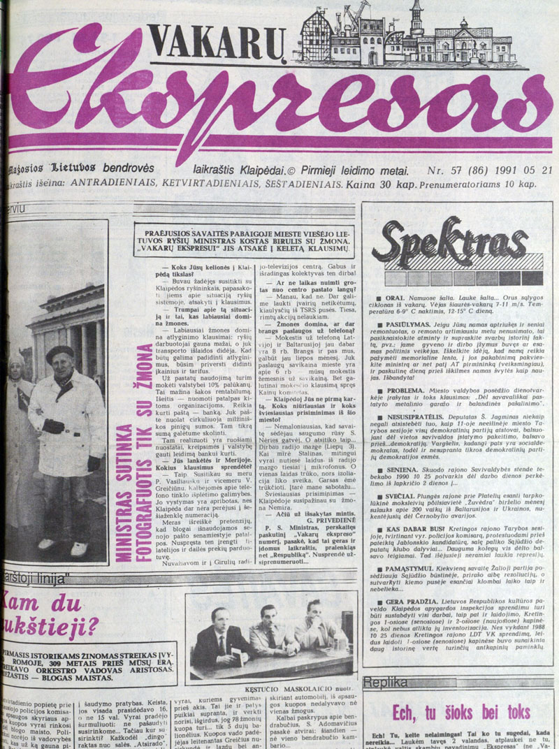 "Ech! Tu, kelte nelaimingas! Tai ko tu sugedai, kada nereikia... Laukėm tavęs 2 valandas, atplaukei ne tu, atplaukė valtis skambiu pavadinimu "Ekspresas" (ne "Vakarų"). Sumokėjom mes tą kurortinę rinkliavą - 1 rublį. Ir, ačiū dievui, vaikai iš buriavimo ir šaudymo iš lanko treniruočių, taip pat Kaliningrado "sietkininkai" bei šiaip geros valios žmonės vargais negalais pasiekė Lietuvą.