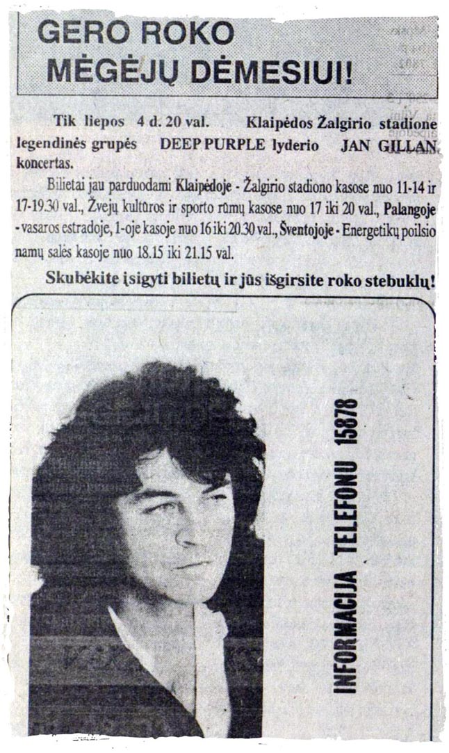 Na, o šiaip gyvenimas tekėjo įprasta vaga - klaipėdietė Natalija Murnikova tapo Europos kultūrizmo čempione (pagal NABBA versiją), apie mokymo niuansus žurnalistams pasakojo vietoje Klaipėdos politechnikumo įkurtos Aukštesniosios technikos mokyklos direktorius Kęstutis Lingys (dabar - daugeliui miestiečių gerai žinomos bendrovės "Armi Servisas" vadovas), o tikri roko mėgėjai šlavė vos po 25 rublius kainavusius bilietus į Jano Gilano (Ian Gillan) - buvusio legendinės grupės "Led Zeppelin" vokalisto ir Jėzaus partijos atlikėjo ne mažiau legendinėje roko operoje "Jėzus Kristus superžvaigždė" - koncertą, kuris turėjo įvykti...