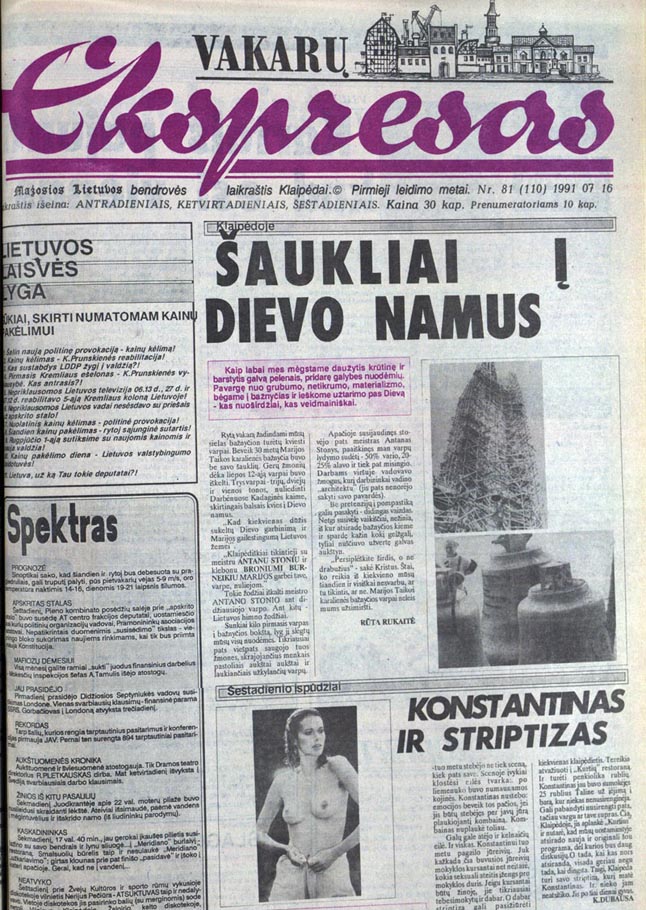 Taigi, 1991-ųjų liepą, vos vienos dienos skirtumu, Klaipėdoje atsirado du dalykai - varpai bažnyčios bokšte ir striptizas. Visiškai tarpusavyje nederantys dalykai, nors, kiek pažaidęs raidėmis ir bokšto įvaizdžiu, galėtum juos ir suderinti...