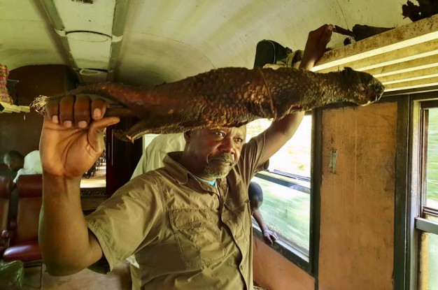 Traukinio keleiviai pirko su visu kailiu vytintas mažąsias antilopes, dygliakiaules ir krovė jas virš galvų, bagažo laikymo vietoje. O kvapas nuo jų sklido siaubingas. Visi vagonai dvokė dvėseliena. Čia niekas neturi elektros ar šaldytuvų, sumedžiotus gyvūnus džiovina saulėje, bet tokiame karštyje jie greitai ir pūti pradeda.